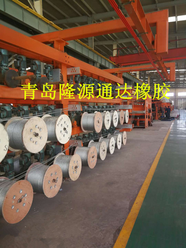 隆源橡胶生产钢丝绳输送带已有多年历史,积累了一定的生产经验。输送带的钢丝绳型生产线大致有2种类型,一种是平板硫化机固定的,带坯逐段成型逐段硫化,带坯内的钢丝绳张力每 硫化一段择放一次。另一种类型是平扳硫化机 安装在一台小车上.小车可沿轨道移动,一次成型相当长度的带坯,然后分段硫化,茌分段硫化过程中,钢丝绳张力并不释放,一直到成型好的带坯完全硫化完毕才释放钢丝绳张力。 接着,平板硫化机及成型小车退回到起始工作位置,再次成型。周而复始地进行上述过程。